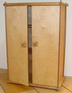 Mein erstes von mir selbst gefertigtes Möbelstück im Holzknoten-Design. In diesem Fall wird der Schrank als Kleiderschrank verwendet und kann einseitig mit einer Kleiderstange ausgestattet werden. Durch die Verwendung einer Lochreihe mit Bodenträgern, können beliebig viele Einlegeböden eingesetzt werden. Auch mehrmaliges auf- und abbauen verringert nicht die Stabilität des Schrankes. So wird jeder Umzug ein Kinderspiel. Von Massivholz, furnierte Platte oder Kunststoff beschichtete Platte bis hin zu Mitteldichte Faserplatte oder sogar Plexiglas(Acrylglas) lassen die möglichen Materialien keine Wünsche offen. Alle genannten Materialien wurden erfolgreich auf Stabilität und Haltbarkeit getestet.